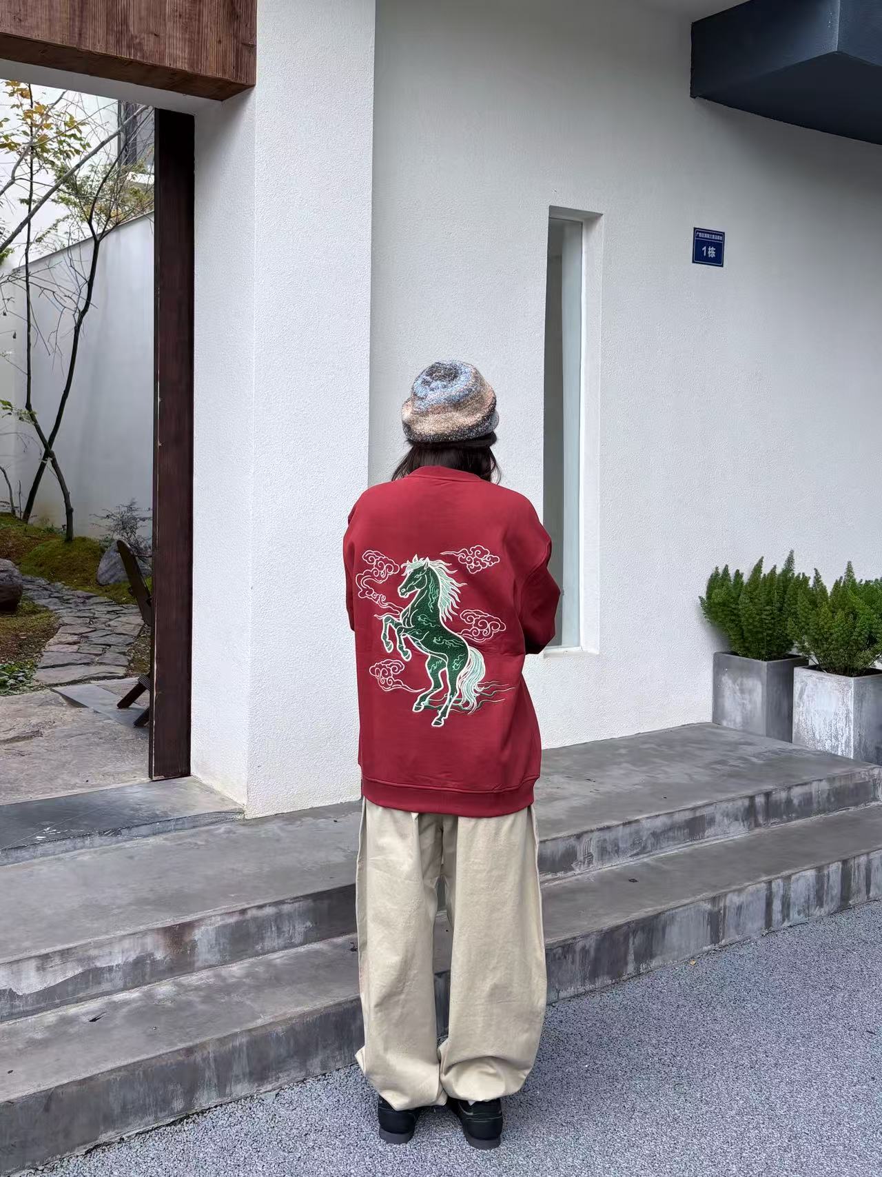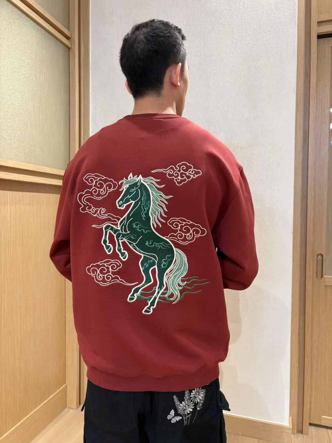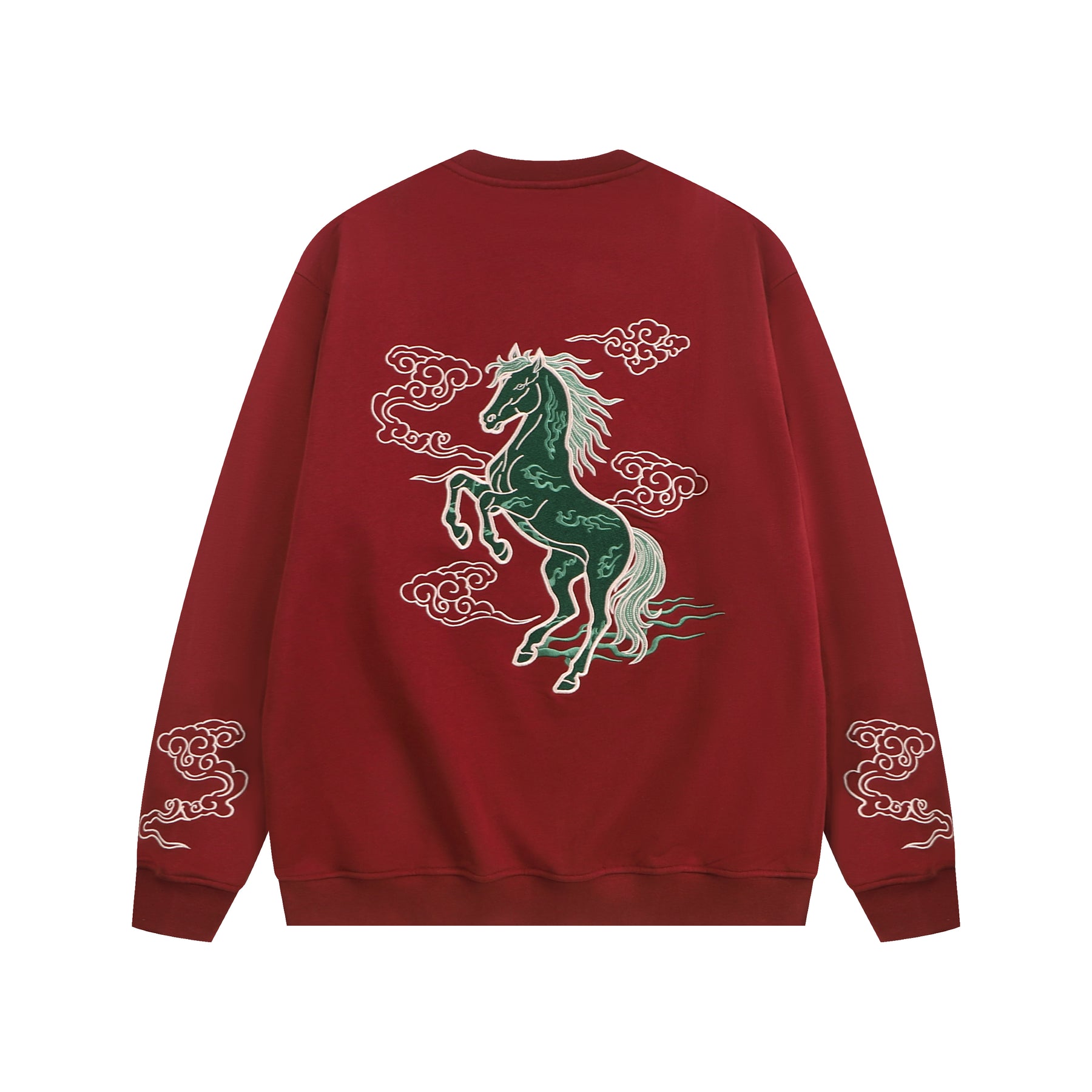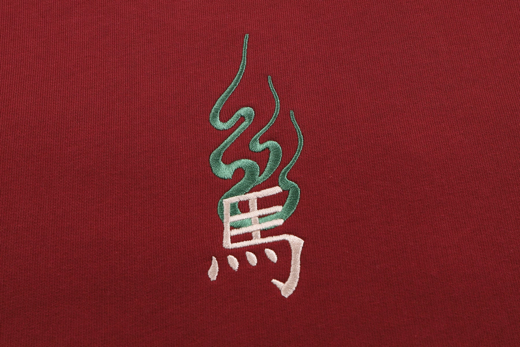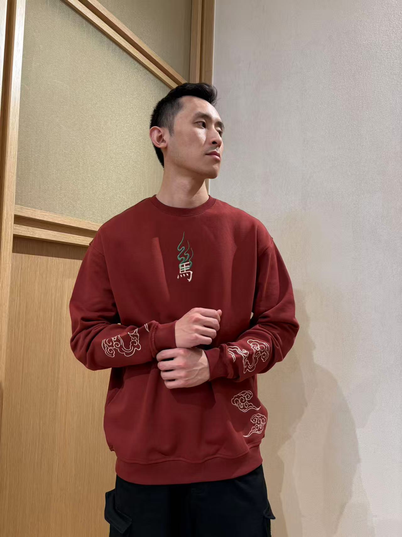 This oxblood crewneck blends rich colour with symbolic embroidery to honour the spirit of the Imperial Jade Fire Horse. The back features an intricately embroidered imperial jade horse, representing strength, vitality, and forward momentum for the Lunar New Year. At the centre of the chest, the traditional Chinese character for “horse” is embroidered and crowned with a flame, symbolising passion, transformation, and auspicious energy.