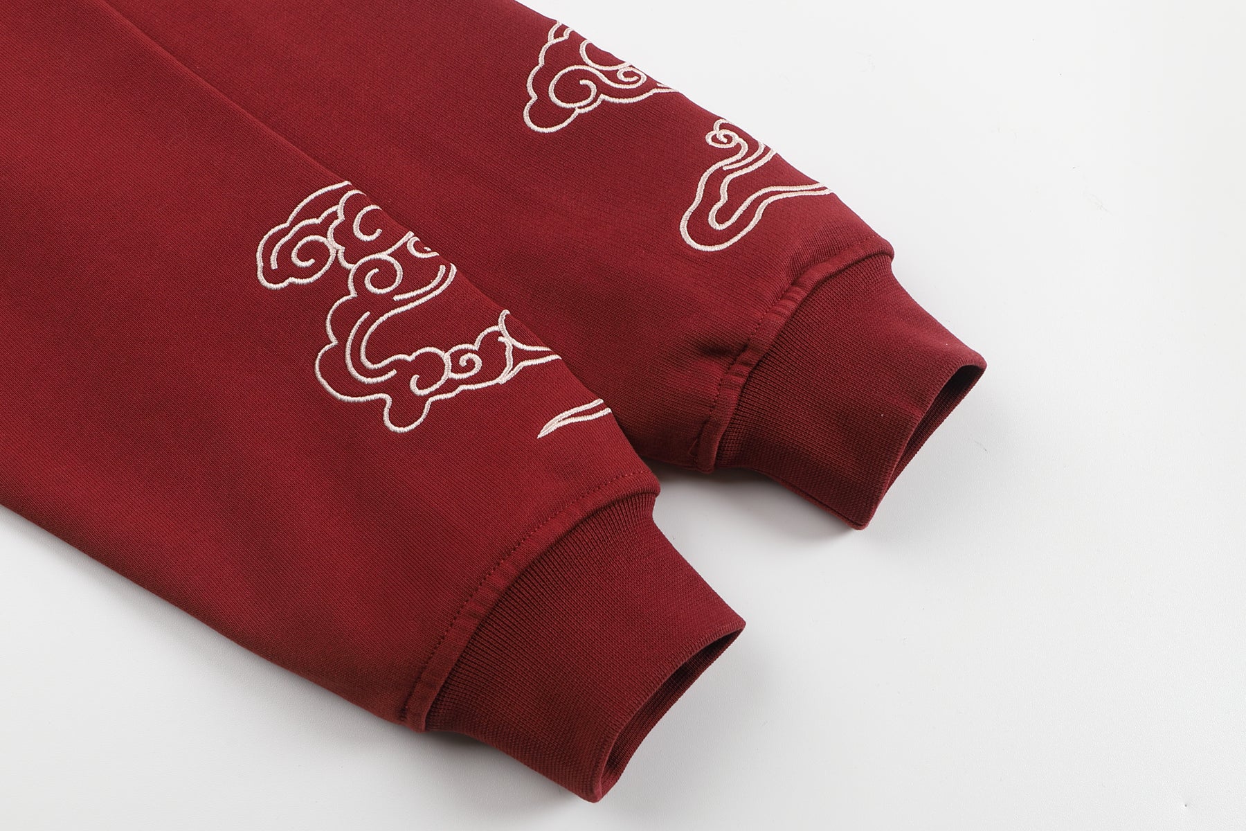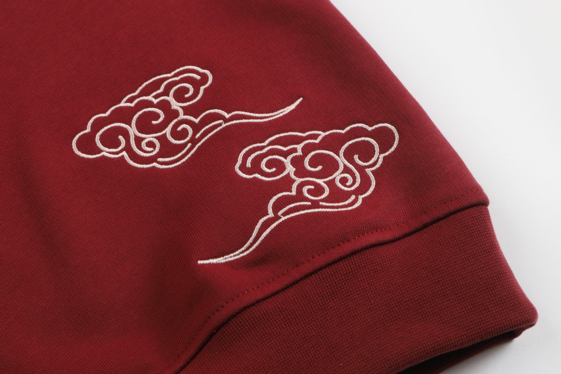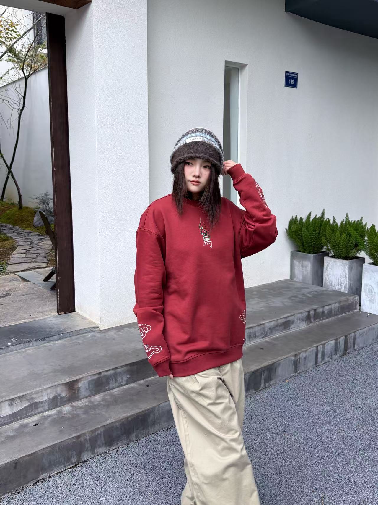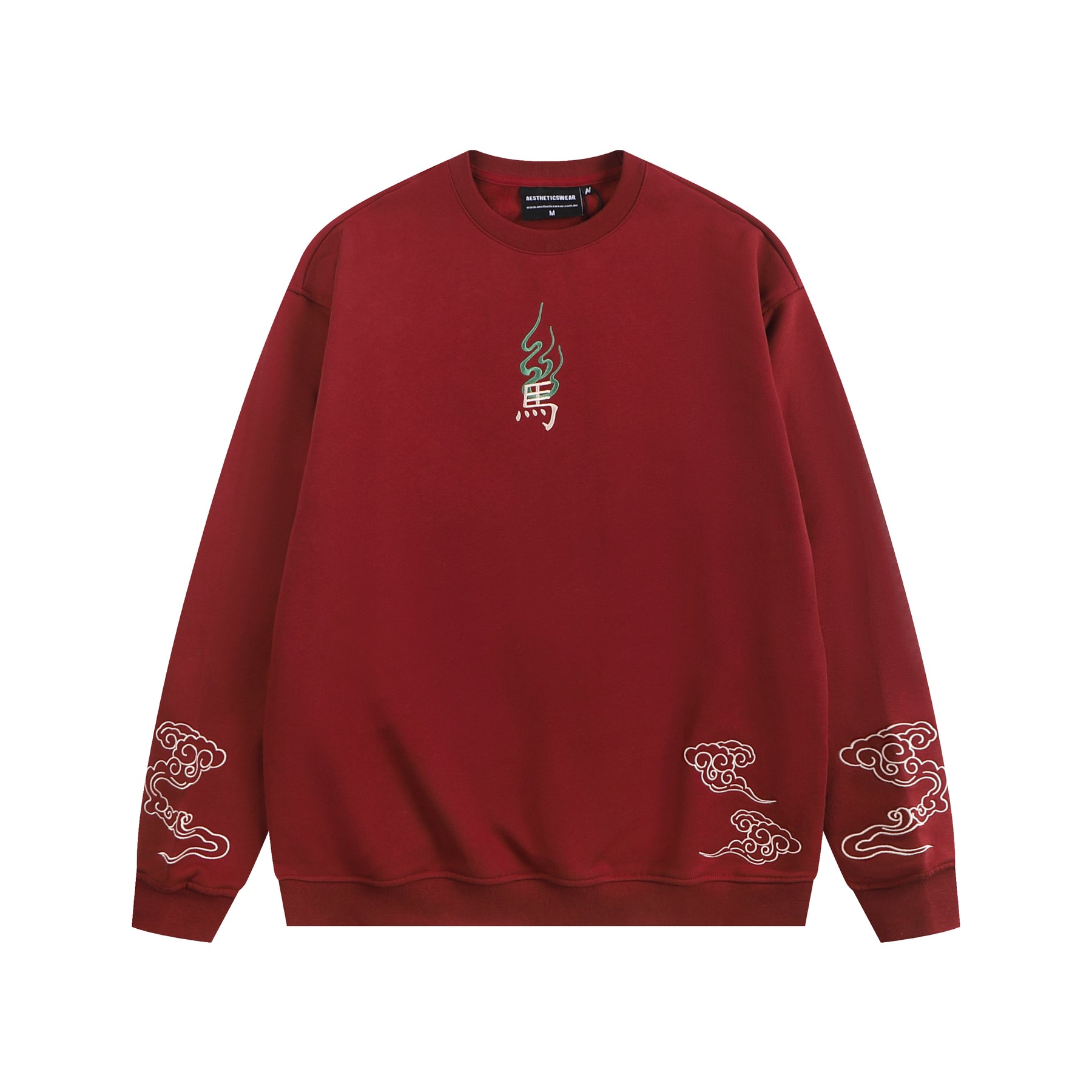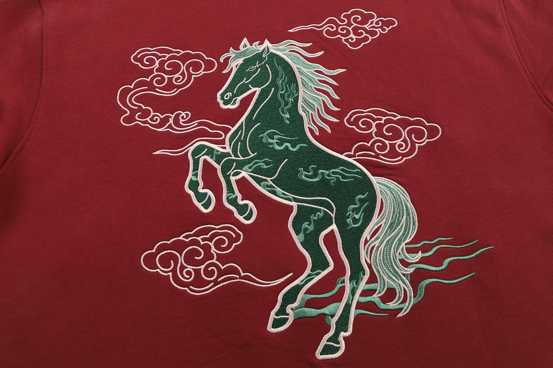 This oxblood crewneck blends rich colour with symbolic embroidery to honour the spirit of the Imperial Jade Fire Horse. The back features an intricately embroidered imperial jade horse, representing strength, vitality, and forward momentum for the Lunar New Year. At the centre of the chest, the traditional Chinese character for “horse” is embroidered and crowned with a flame, symbolising passion, transformation, and auspicious energy.