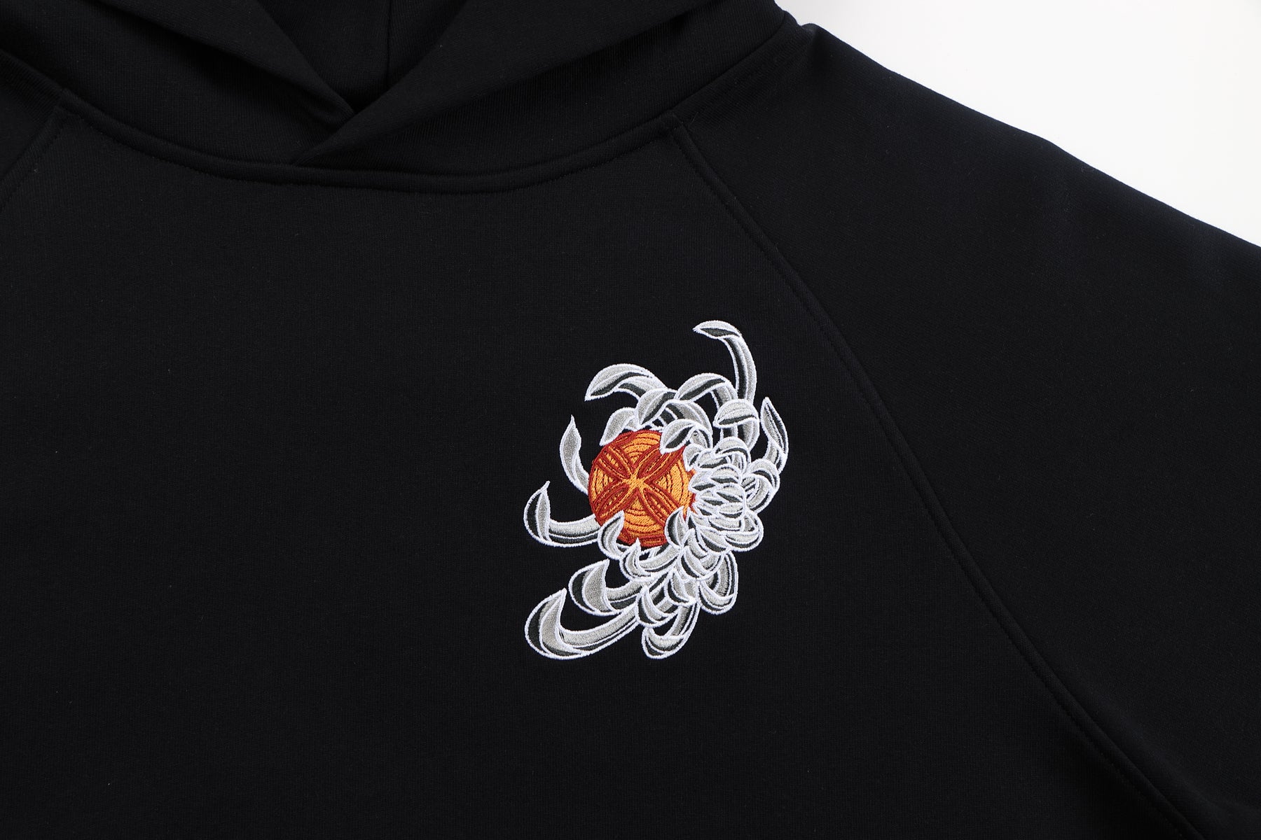 - Embroidered chrysanthemum flower with orange ball on the front chest