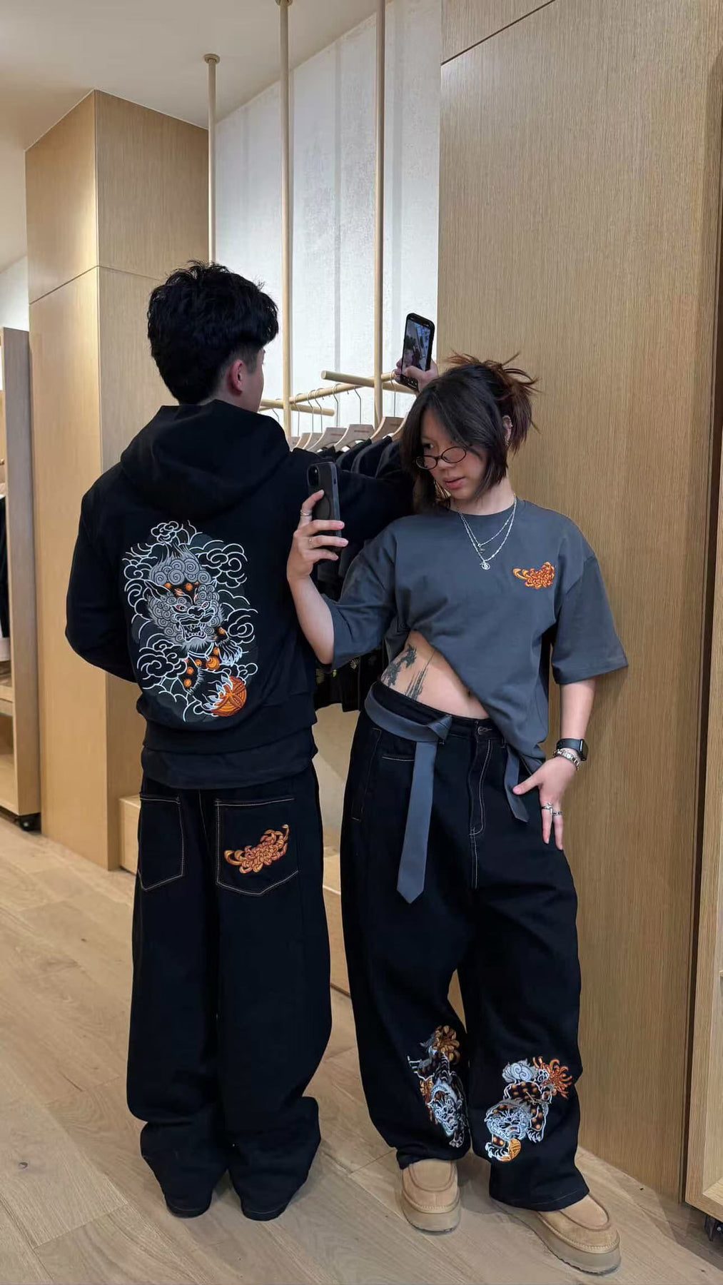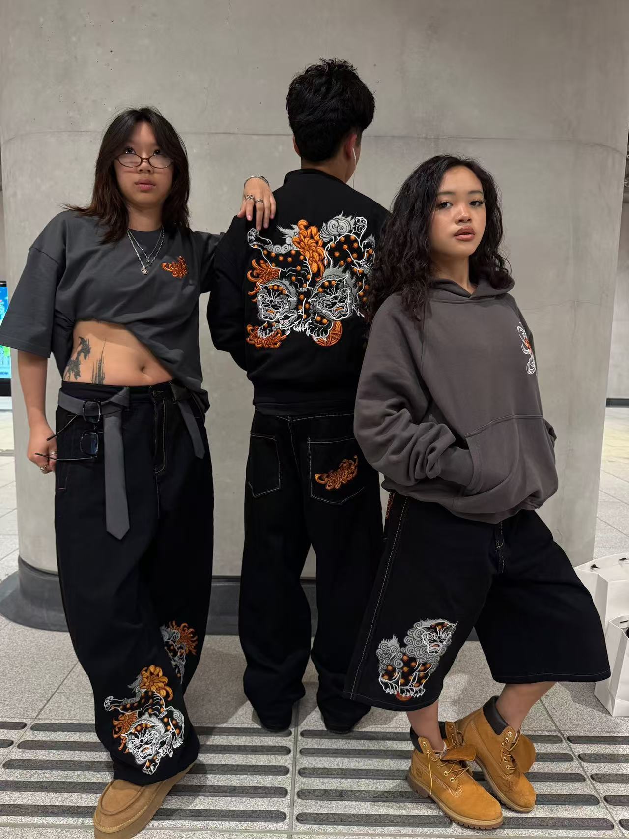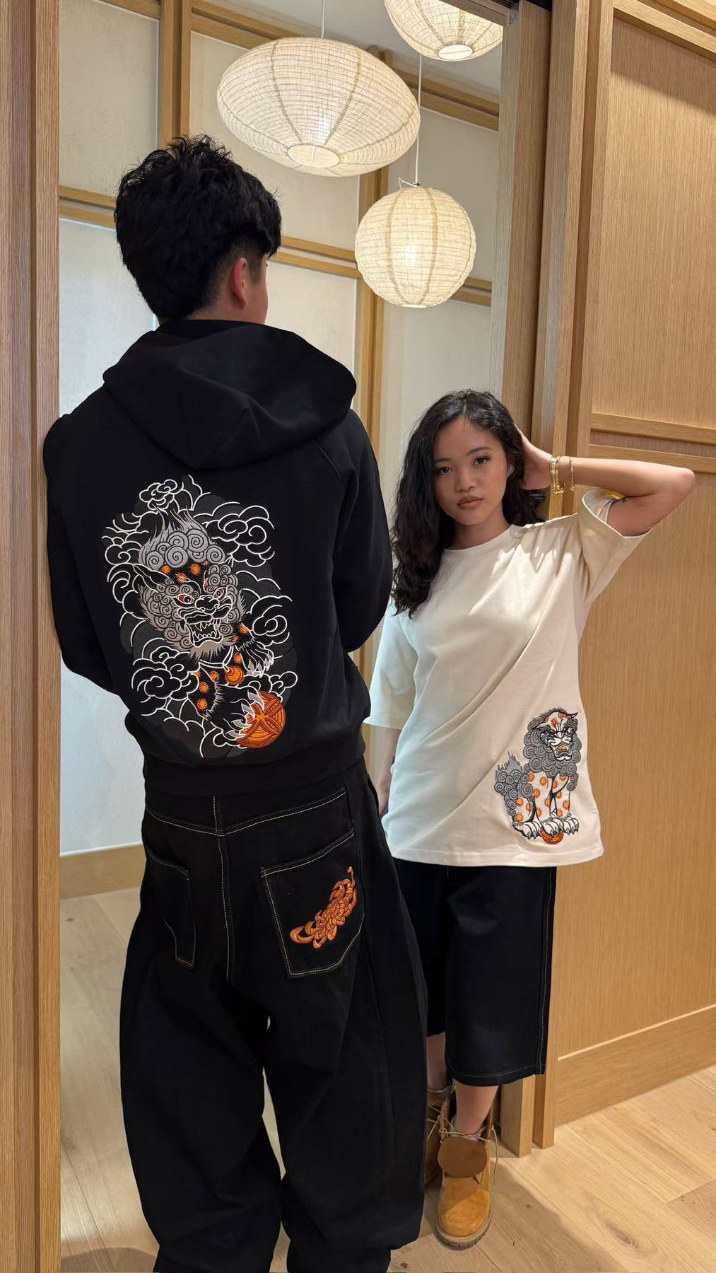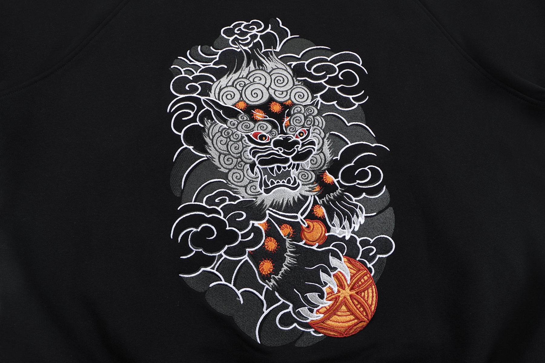 - Embroidered foo dog with ball on the back