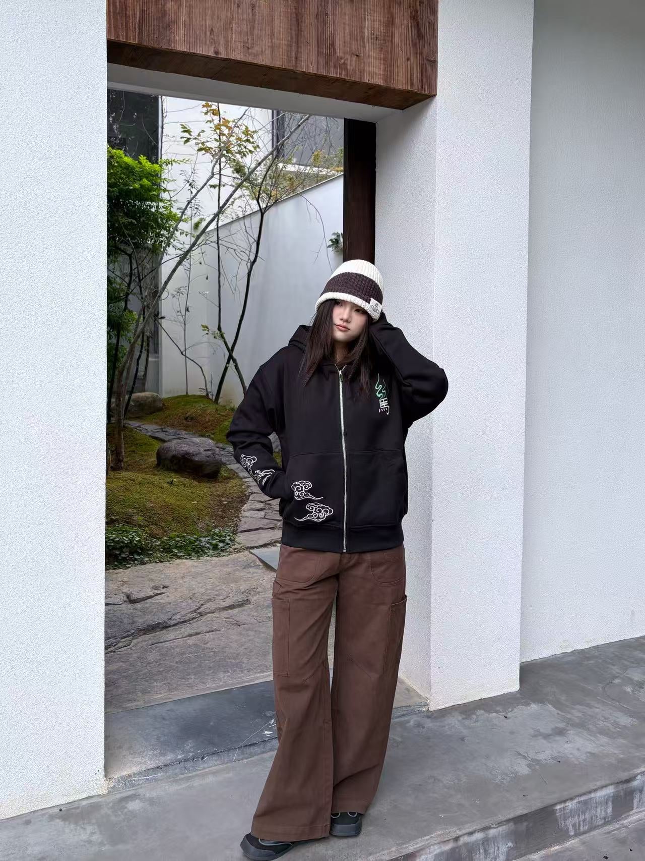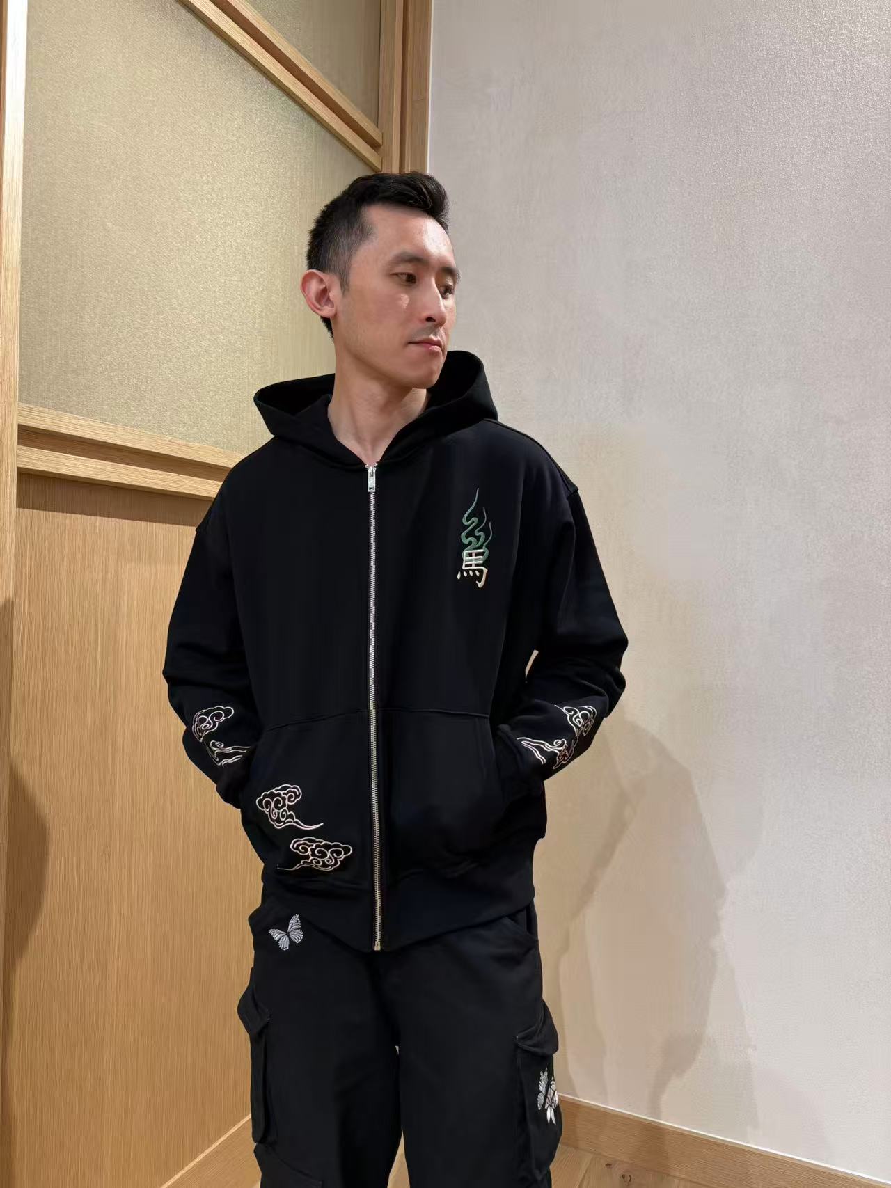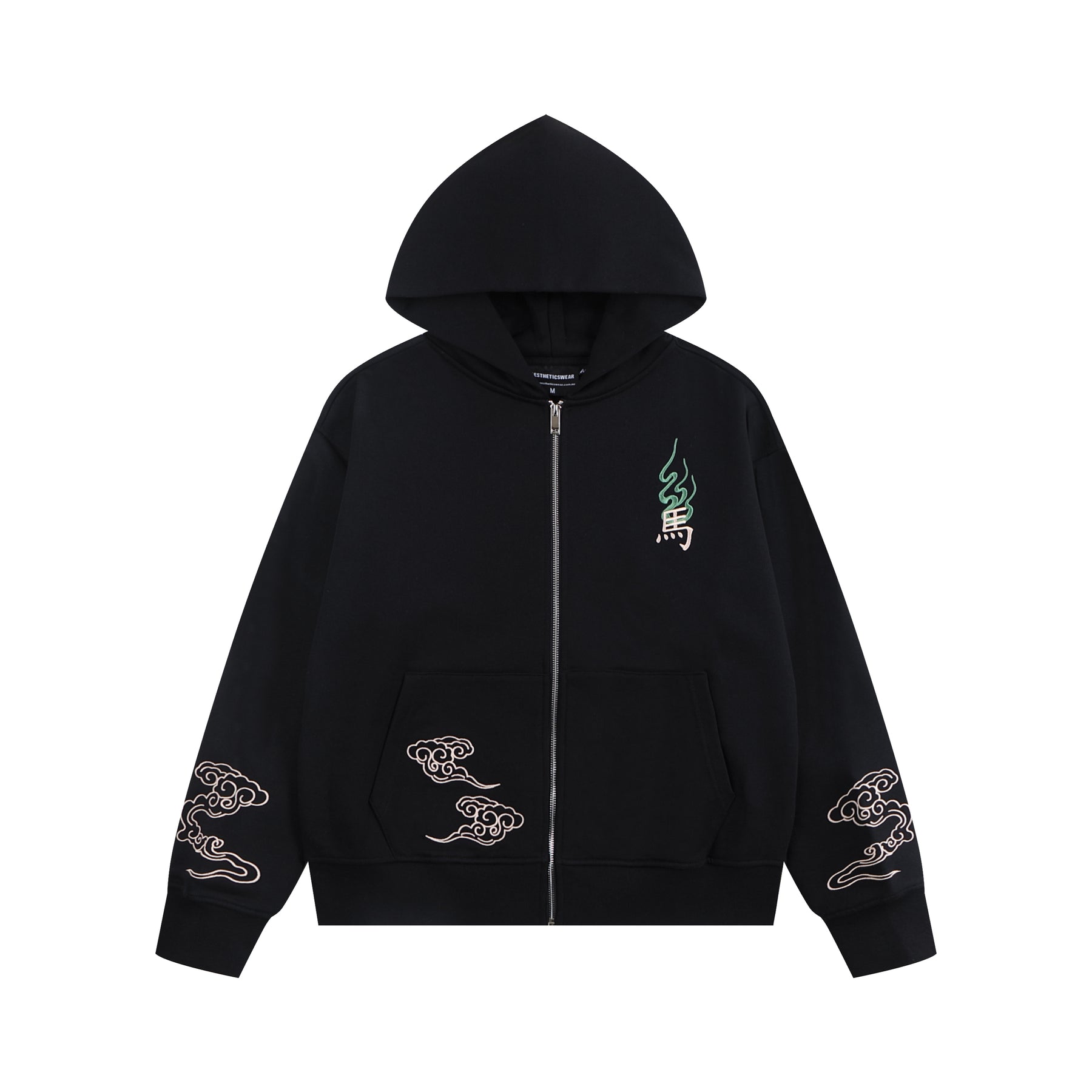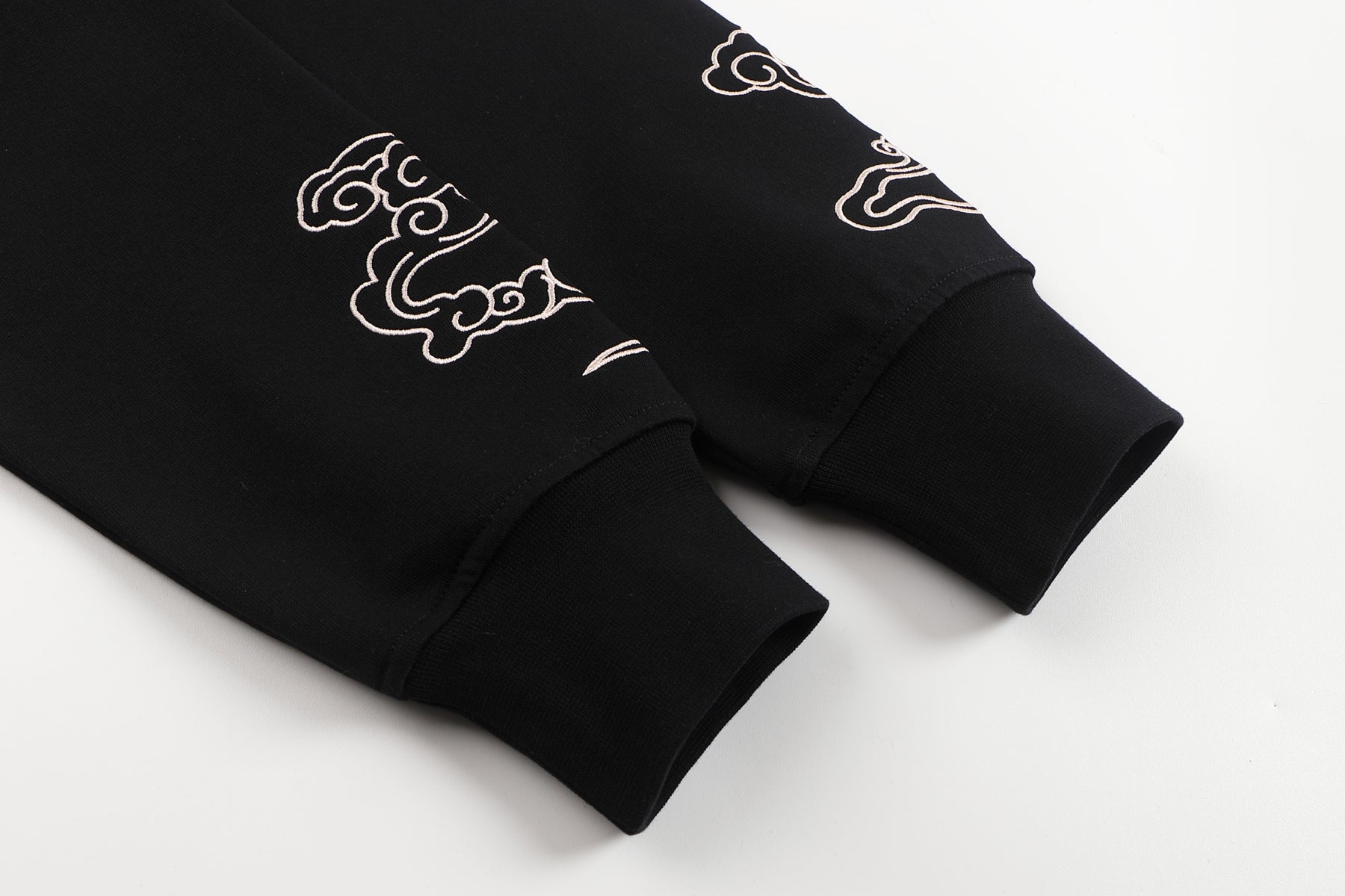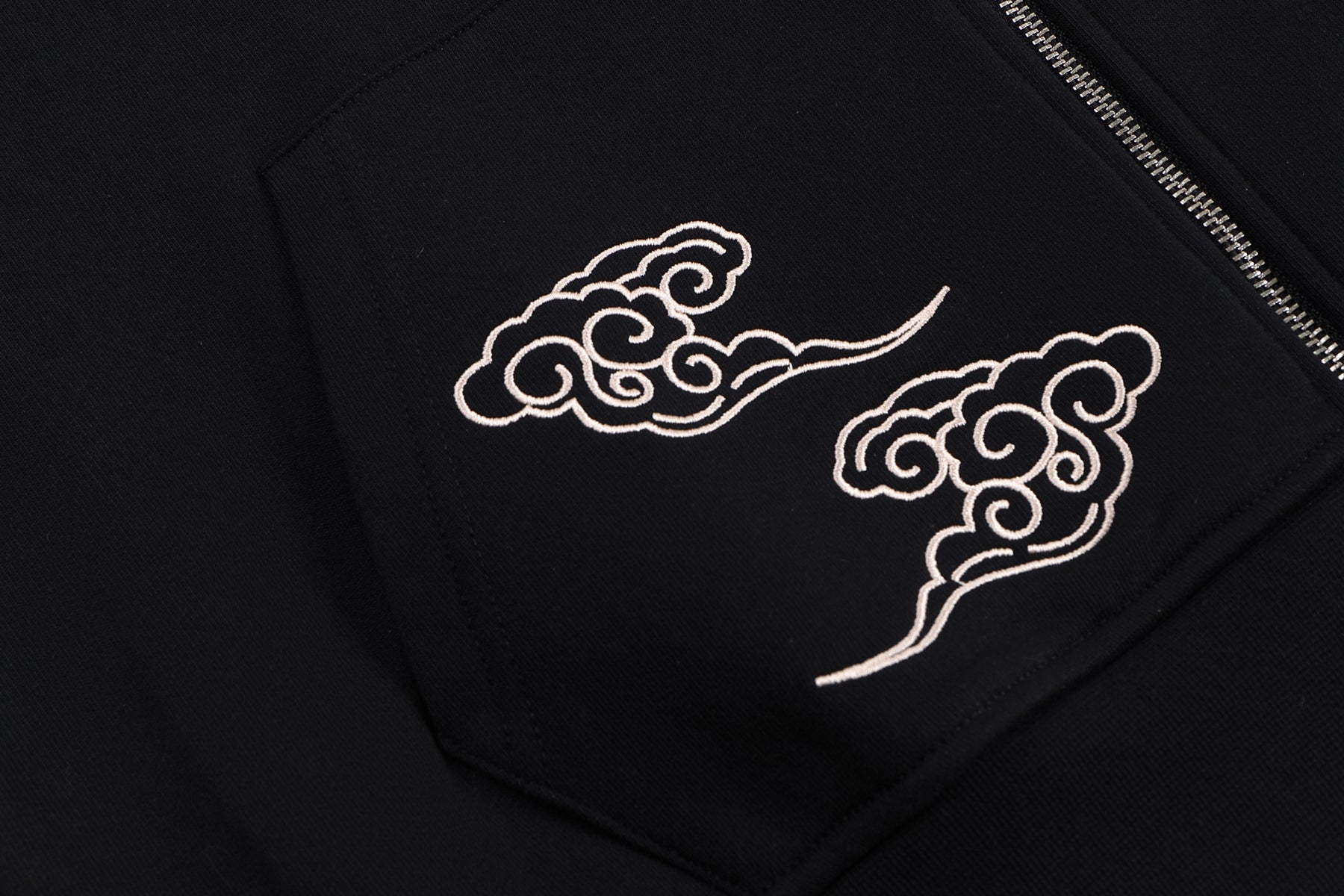 Embroidered cloud motifs flow along the sleeve and front pocket, adding movement and harmony while echoing classic auspicious artwork.
