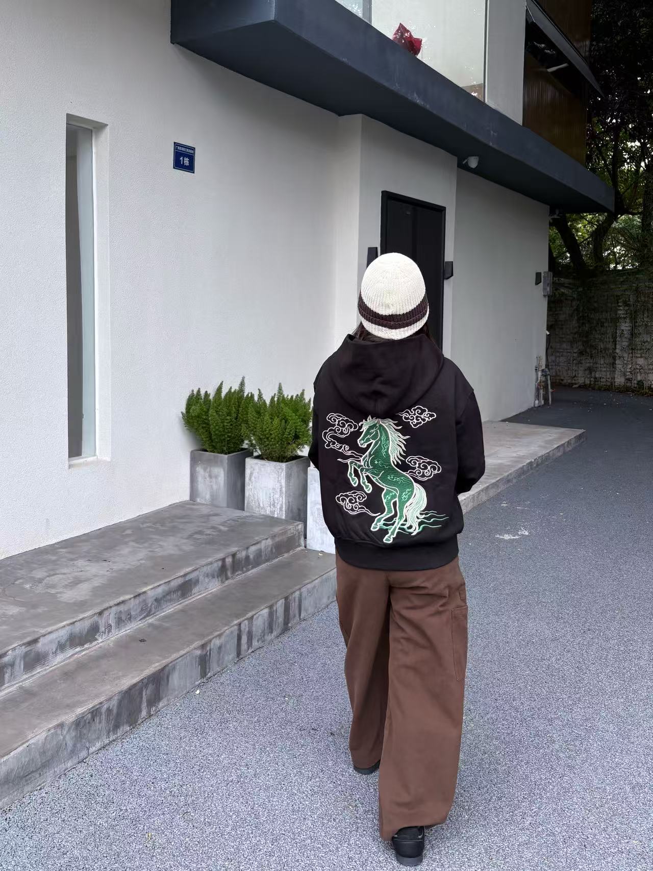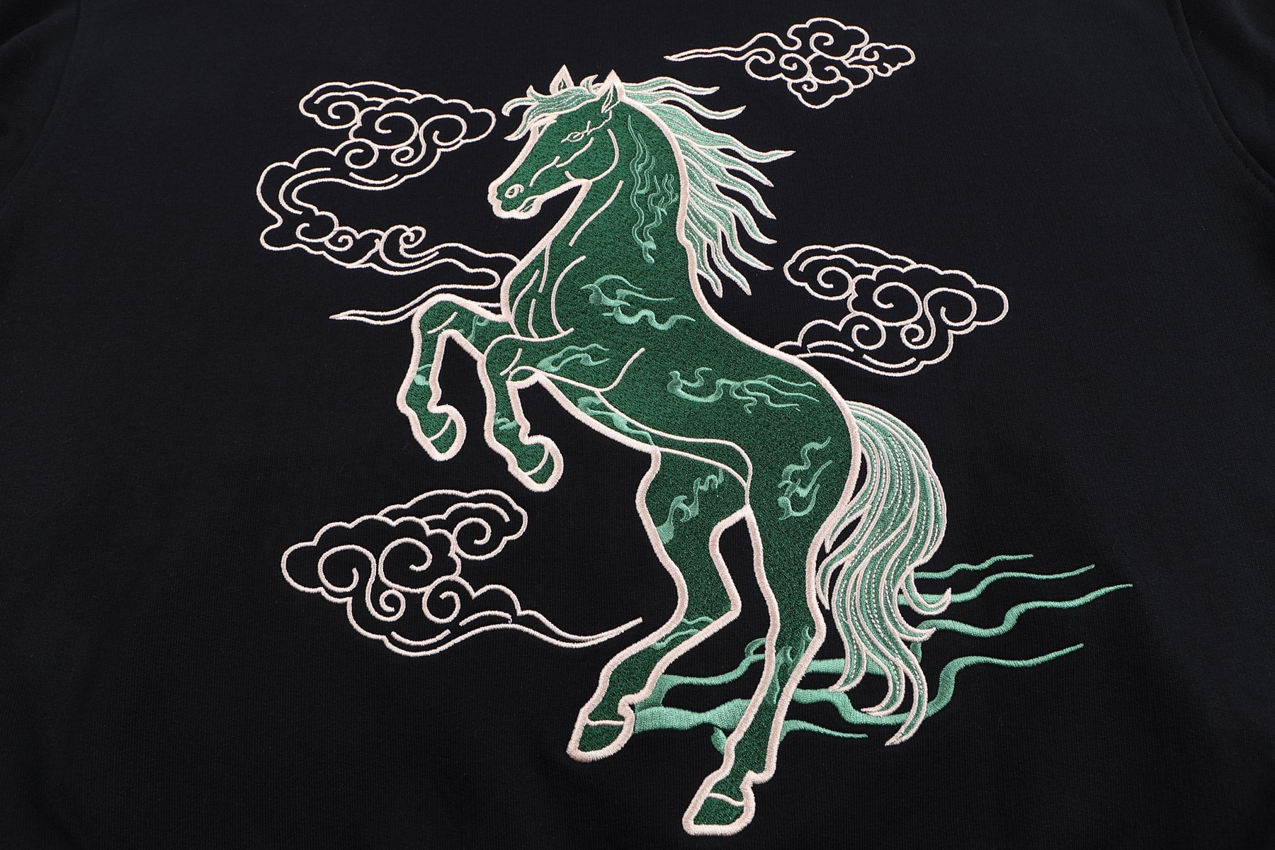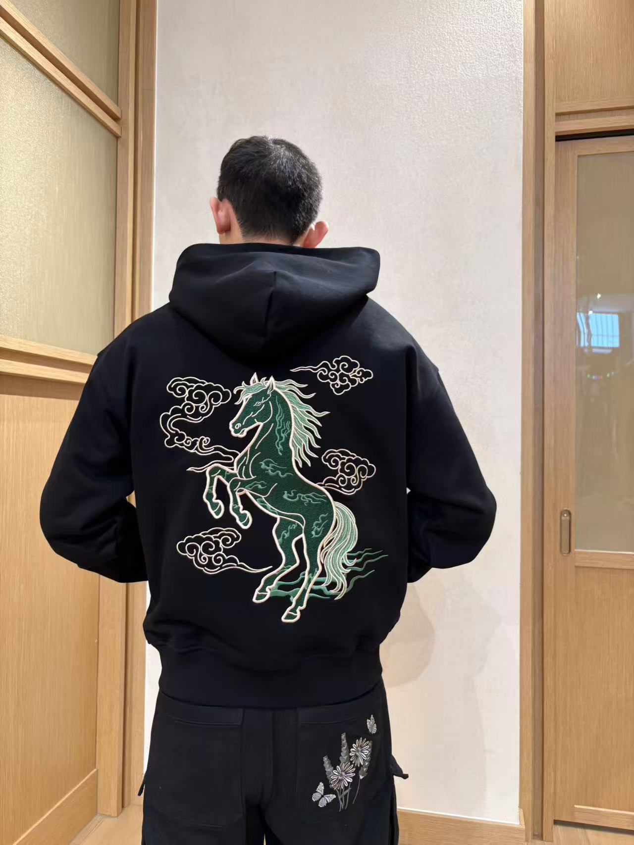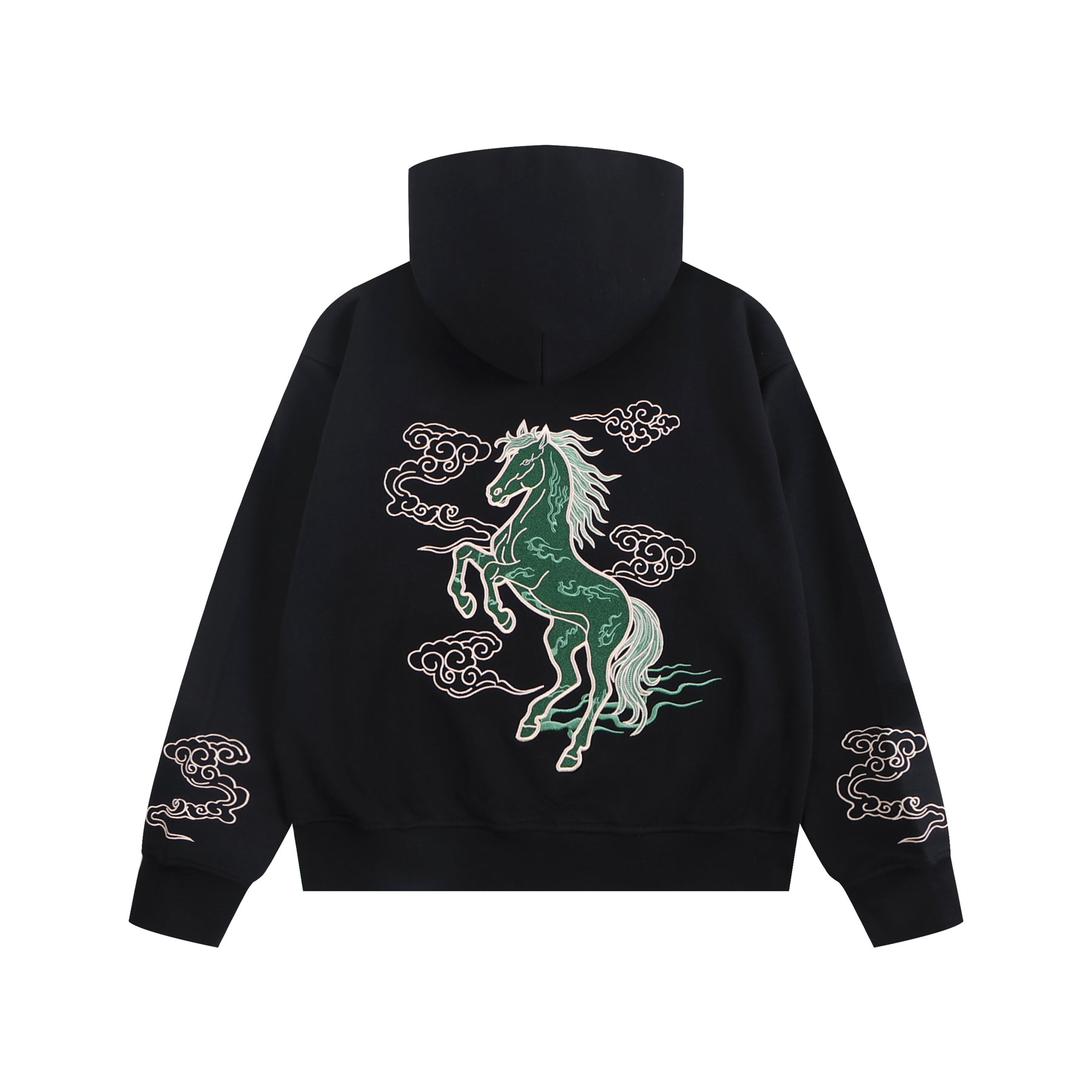 This zip-up hoodie brings the spirit of the Imperial Jade Fire Horse to life in a statement piece designed for the Lunar New Year. The back features an embroidered fire horse in imperial jade tones — a symbol of power, vitality, and forward momentum. The front showcases the traditional Chinese character for “horse,” crowned with flame detailing to represent passion, transformation, and an auspicious start to the year.