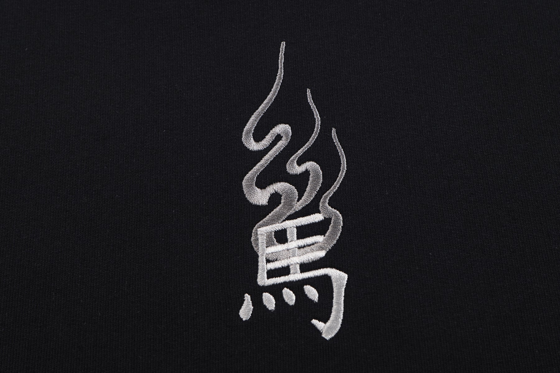 • Embroidered Chinese character for "horse" with flame on front chest