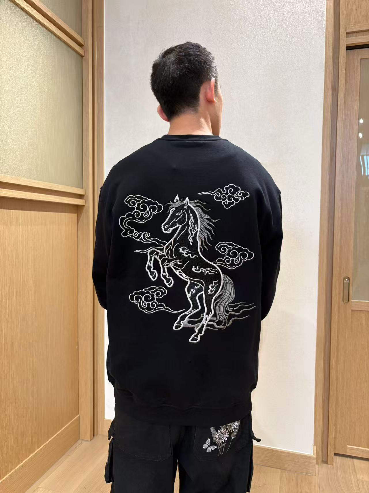 This crewneck jumper channels the power and elegance of the Fire Horse in a refined monochrome palette. The back features a striking black embroidered fire horse, symbolising strength, independence, and unstoppable momentum for the Lunar New Year. At the centre of the chest sits the traditional Chinese character for “horse,” adding a bold focal point grounded in heritage.