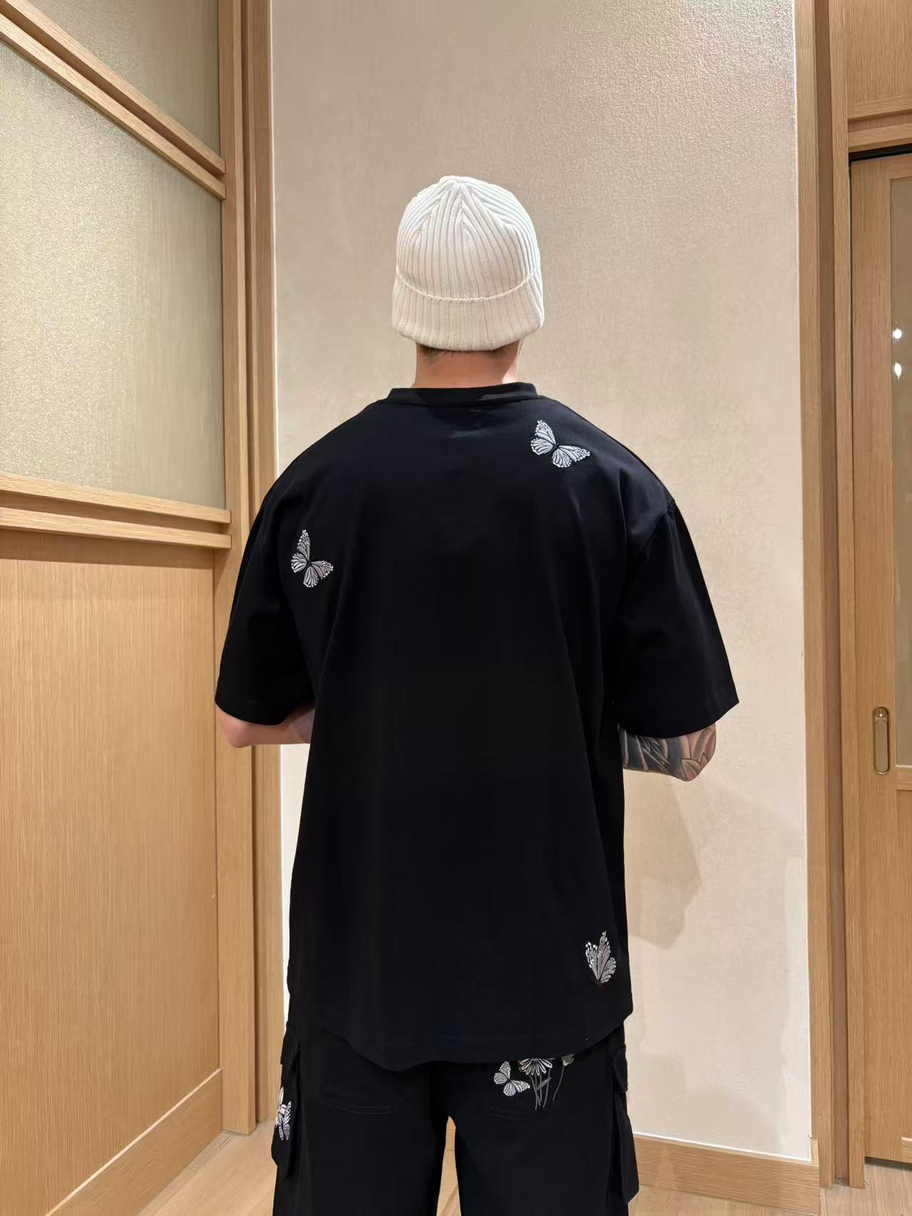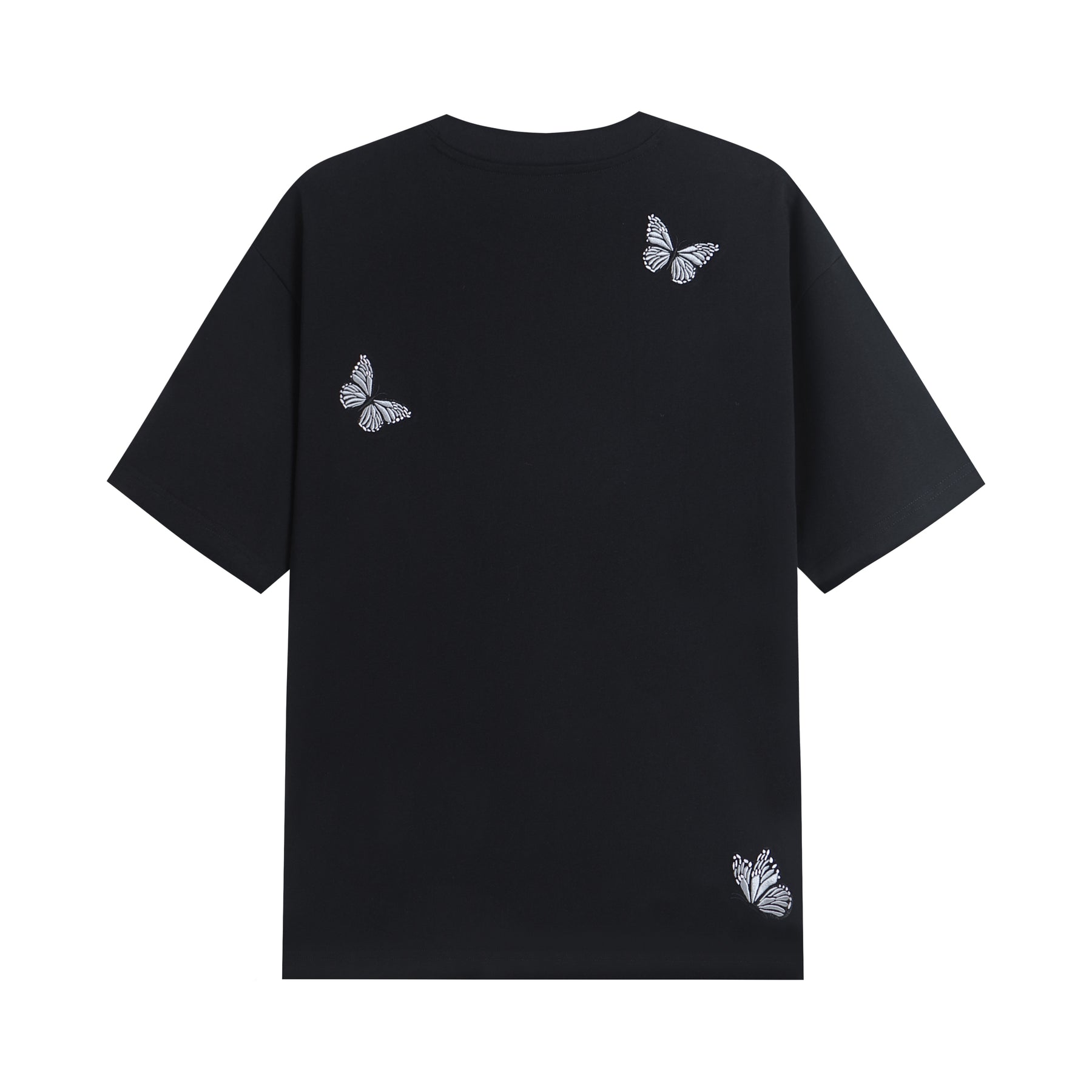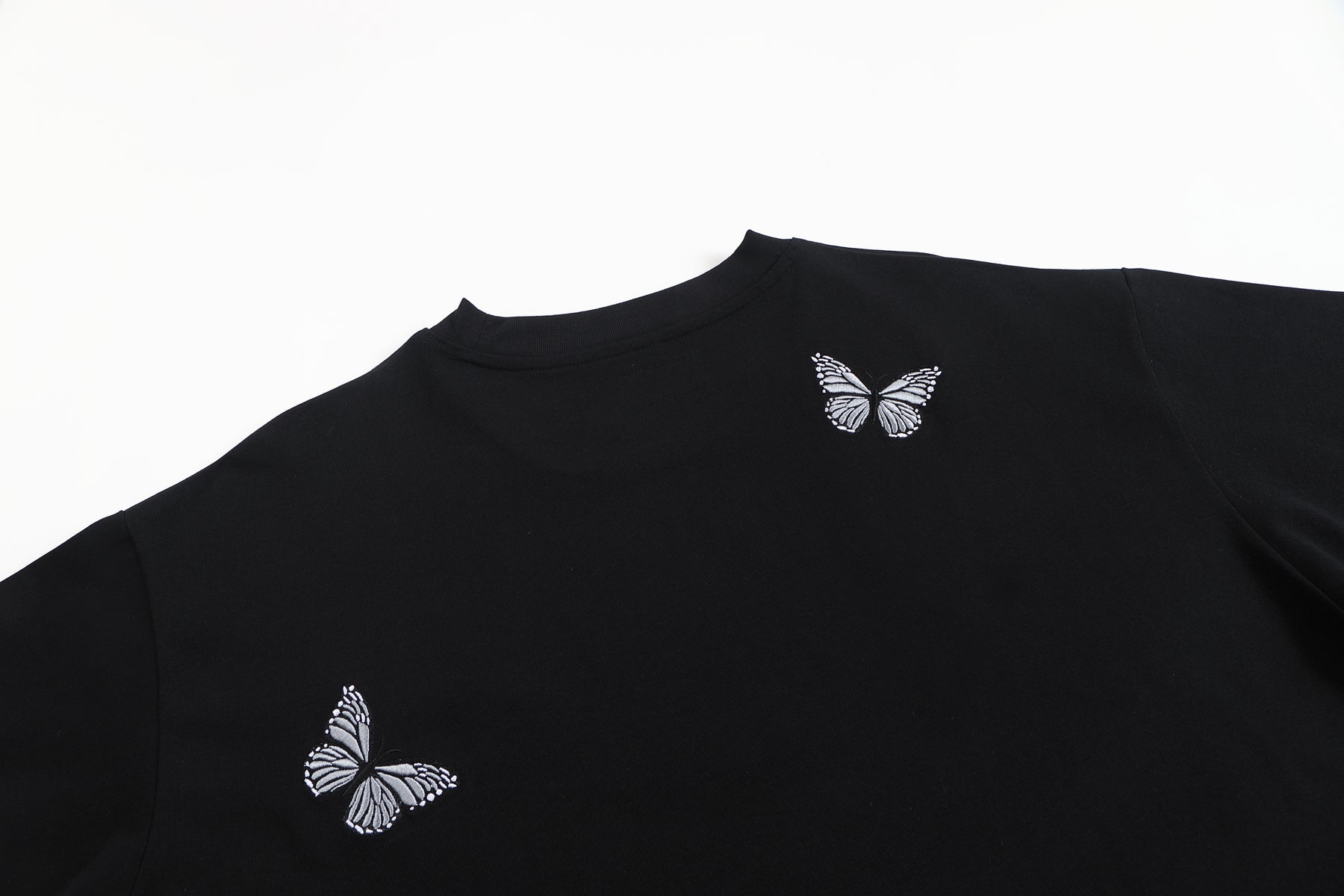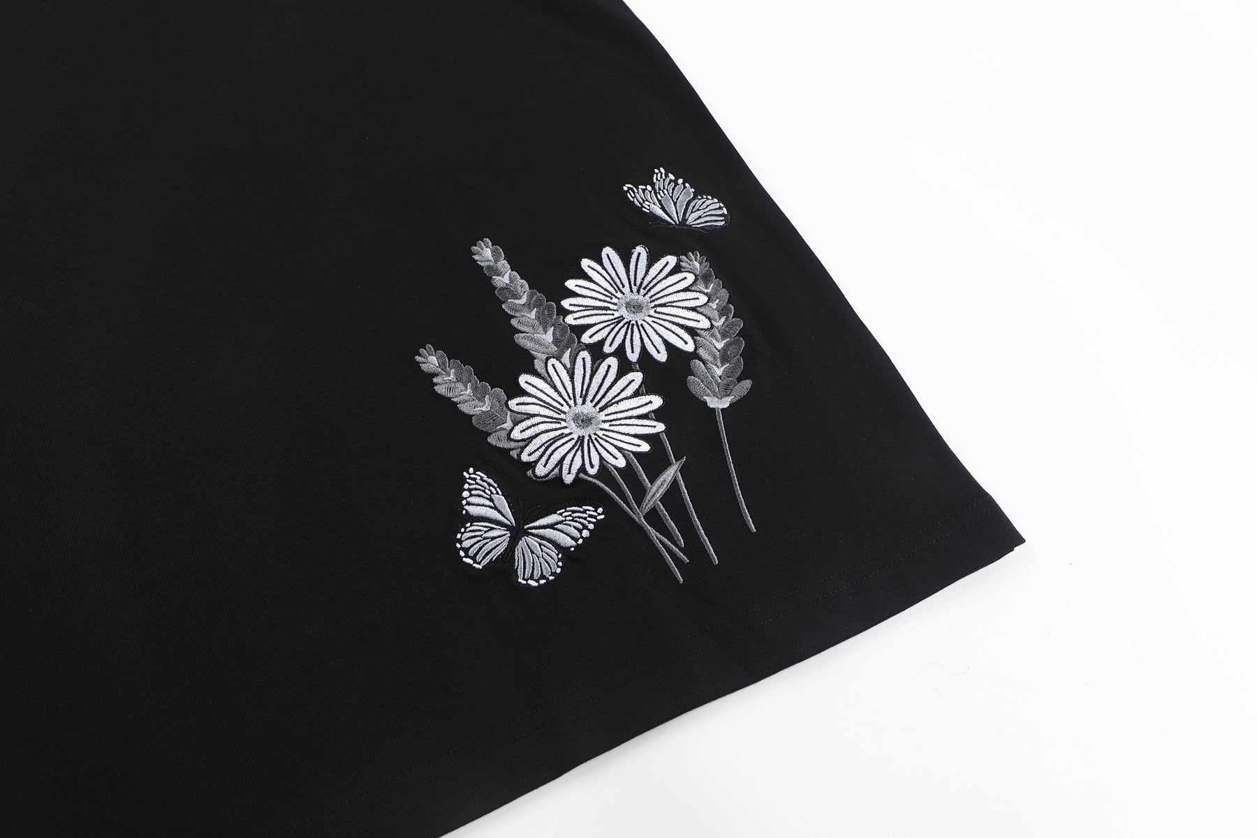 Embroidered Butterflies & Daisies T shirt (Oversized) - Black/Greyscale